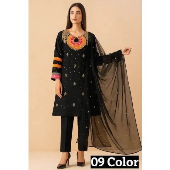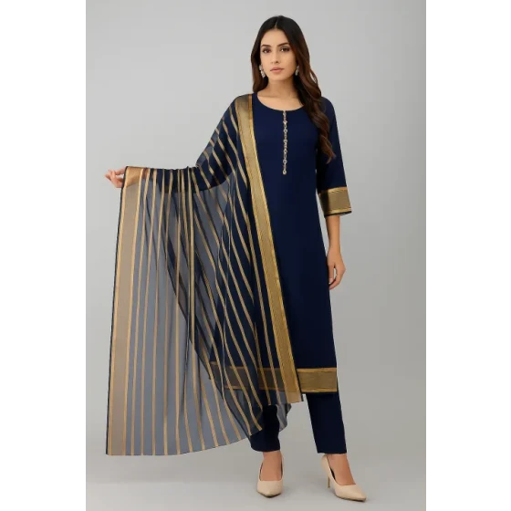 沙·卡马尔面料 3件套未缝合Katan丝质素色衬衫和裤子,配有欧根纱衬里披肩,适合女性
